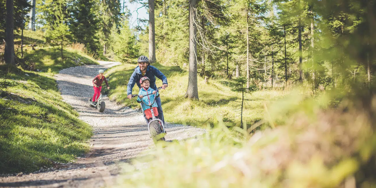 How about a ride on the longest summer toboggan run in Tyrol? A climbing session at the rope course in Bichlbach? Whiz down the slopes on a monster scooter, mountain scooter, or mountain cart. And there are fascinating hikes, such as Moosle’s research trail, Moosle’s magic forest, the Biberfad, and the “Zugspitzi” water adventure trail on the Gaisbach, waiting to be discovered by inquisitive junior researchers and adventurous water nymphs.